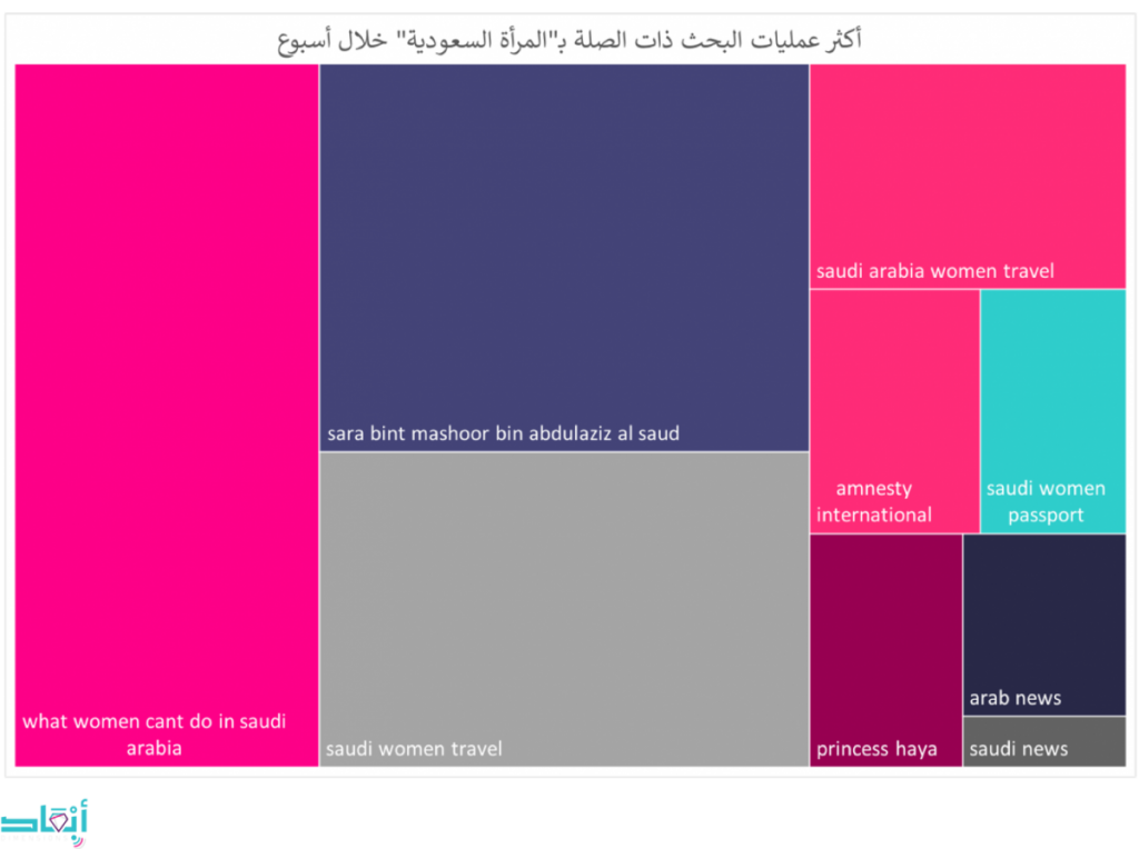 يظهر المقياس التالي المواضيع الأكثر رواجًا ذات الصلة بعمليات البحث عن "المرأة السعودية" خلال أسبوع ويبدو جلياً بحث المستخدمين بكثرة عن "ما لا يمكن للمرأة أن تفعله في السعودية"، "ساره بنت مشهور بن عبدالعزيز آل سعود"، "سفر المرأة السعودية"، وغيره.