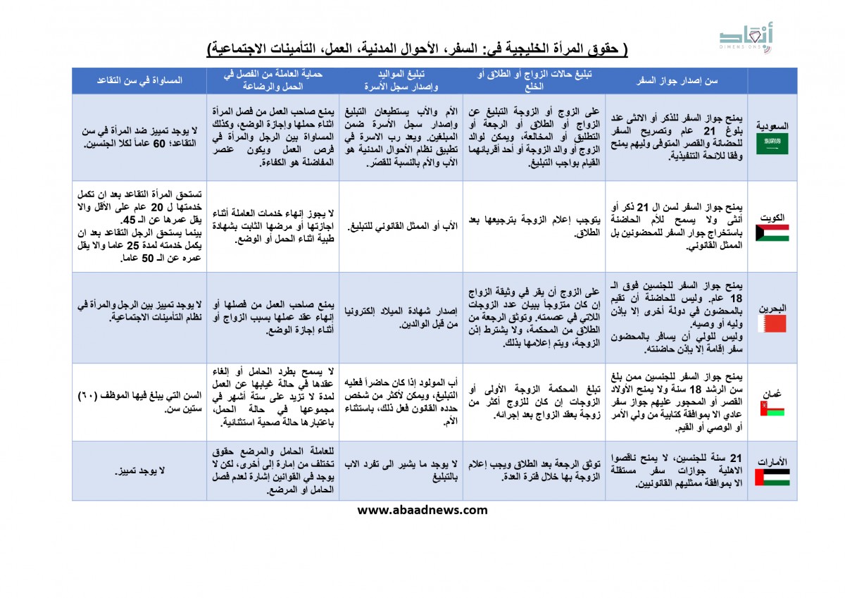 **مراجع محتوى جدول حقوق المرأة الخليجية (السفر، الأحوال المدنية، العمل، التامينات الاجتماعية):