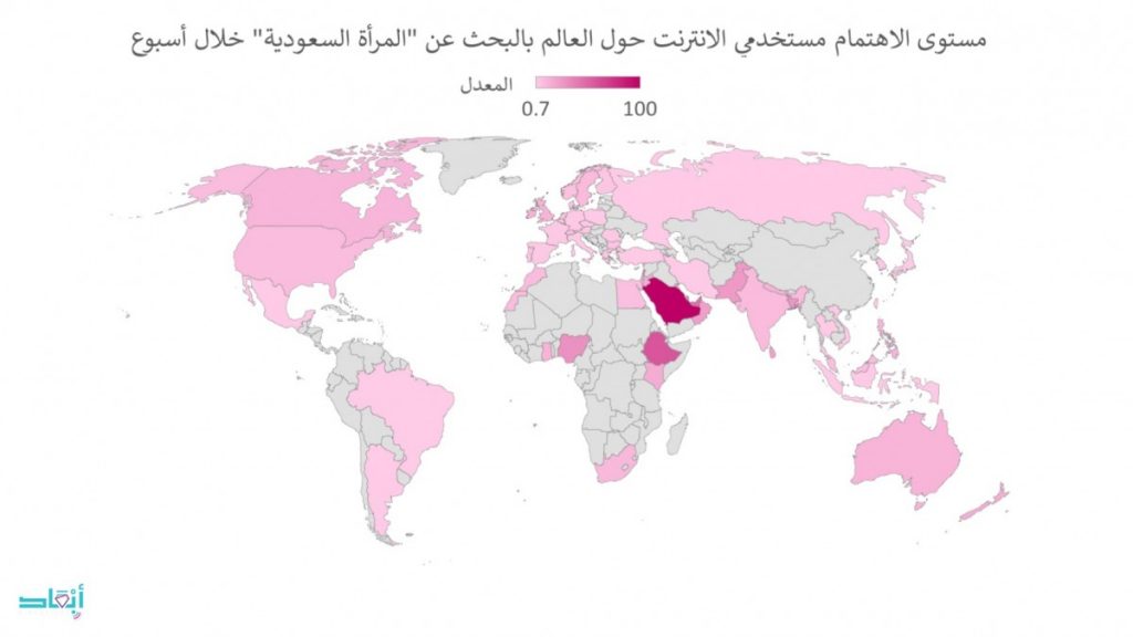 يظهر من الخريطة الحرارية والرسم البياني في الأسفل ارتفاع مستوى البحث عن "المرأة السعودية" بشكل متفاوت في أنحاء العالم ويرتفع غالباً في الدول المجاورة للملكة العربية السعودية كدول الخليج العربي واثيوبيا ولبنان ونيجيريا