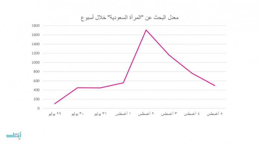 أولاً: تحليل لعمليات البحث عن "المرأة السعودية" خلال أسبوع من كل أنحاء العالميظهر من الرسم البياني التالي نمو البحث حول العالم عن "المرأة السعودية" ووصوله لقمته في ٢ أغسطس ٢٠١٩، ويعود ذلك لنشر القرار في صحيفة أم القرى، وأيضاً