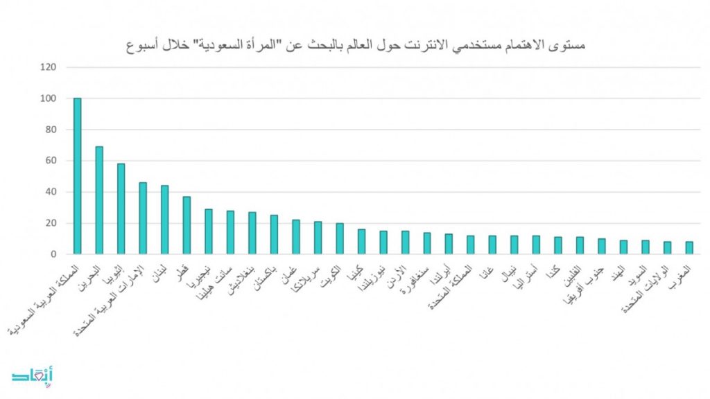يظهر من الرسم البياني انخفاض مستوى البحث باللغة الإنجليزية عن " المرأة السعودية " في دول يفترض أنها مهتمة بحقوق المرأة السعودية مثل بريطانيا وامريكا إلا أن جمهور هذه البلدان لا يهتم ،بينما يظهر اهتمام مستخدمي الإنترنت في السعودية للبحث عن "المرأة السعودية"