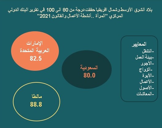 ينظر المؤشر الجديد الصادر عن دراسة “المرأة، أنشطة الأعمال والقانون 2021: إلى عقد من الإصلاحات في حياة المرأة المهنية، من البدء في العمل إلى حصولها على راتب التقاعد، و الحماية القانونية المرتبطة بكل من هذه المراحل لمدة عشر سنوات، حيث يتم إعطاء درجة لكل اقتصاد من الإقتصادات التي يغطيها وعددها 187 وذلك وفقا لثمانية مؤشرات سبق ذكرها
