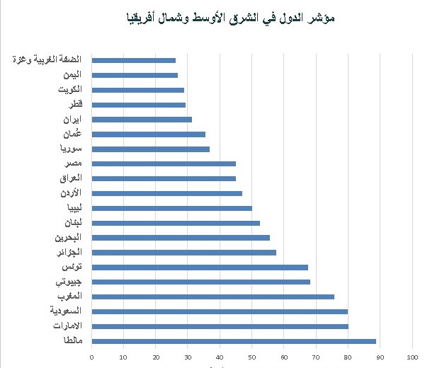 وبالنظر الى دول الشرق الاوسط وشمال افريقيا نلاحظ ارتفاع درجاتها في ريادة الاعمال (83.8) وانخفاض درجاتها في الابوة او الوالدية (34.0)وهي ما تشمل التشريعات المتعلقة بالعمل لدى الام والاب