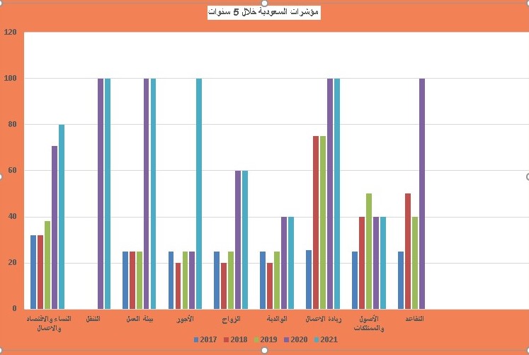 لقد حققت المملكة الدرجة الكاملة التي تبلغ 100 في خمسة مؤشرات رئيسية من أصل ثمانية يقيسها التقرير وهي: (التنقل، والحصول على معاش التقاعد، وريادة الأعمال، وبيئة العمل، والحصول على الأجر)؛ فيما حافظت على درجتها في المؤشرات الثلاثة الأخرى وهي: (الزواج 60.0، والأبوة 40.0، والأصول والممتلكات 40.0)، وتضع هذه النتائج المملكة في مصافّ الاقتصادات المتقدمة التي لها عمق تاريخي في تنفيذ إصلاحات الأنظمة واللوائح المرتبطة بالمرأة ، كما يتضح الرسم البياني في الاسفل الراصد لارتفاع المؤشرات خلال خمس سنوات منذ عام 2017- 2021