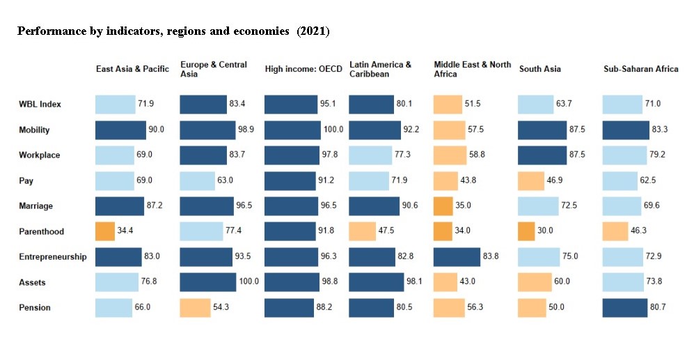 الا ان الدول بحسب كل منطقة قد حاولت الاصلاح ،وقد شهدت اقتصادات الشرق الأوسط وشمال أفريقيا أكبر زيادة في التقدم الاصلاحي، مما أدى إلى إزالة القيود على الوظائف وريادة الأعمال وتقليص فجوة الأجور بين الجنسين والتقاعد . وتحسينات طفيفة في تشريعات الممارسات المتعلقة بالزواج والأبوة والاصول والممتلكات.