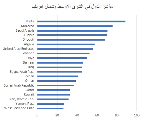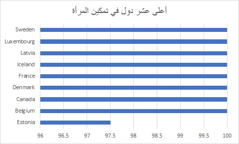 من الرسم البياني نلاحظ أن السويد احتلت المركز الأول في تمكين المرأة اقتصاديا وقانونيا، وأن هناك ستة اقتصادات هي بلجيكا والدنمارك وفرنسا ولاتفيا ولوكسمبورغ والسويد - بدرجة كاملة على المؤشر (100)، مما يعني أنها تمنح النساء والرجال حقوقا قانونية متساوية في مجالات قياس الدراسة.