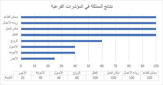 وبحسب نتائج التقرير، حققت المملكة الدرجة الكاملة التي تبلغ (100) في أربعة مؤشرات، وهي: التنقّل، مكان العمل، ريادة الأعمال، والتقاعد.