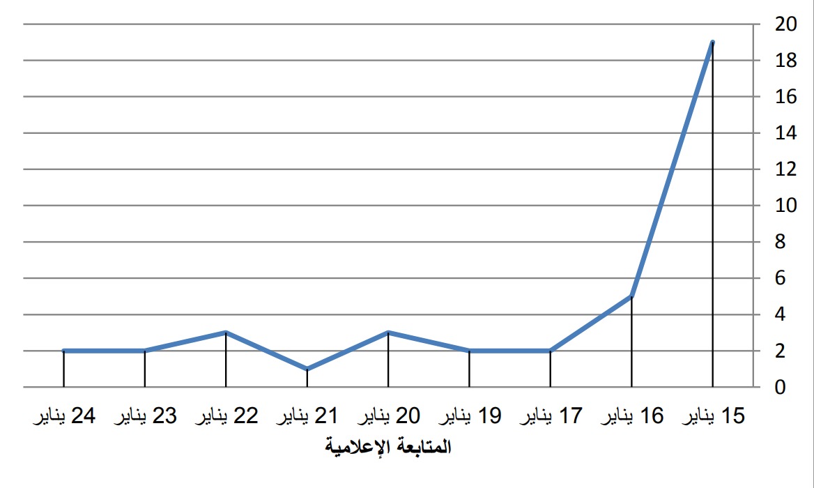 بدأ النشر في الصحف السعودية منذ15 يناير وبدأ يتناقص حتى وصل الى ادنى مستوى له في 24 يناير .
