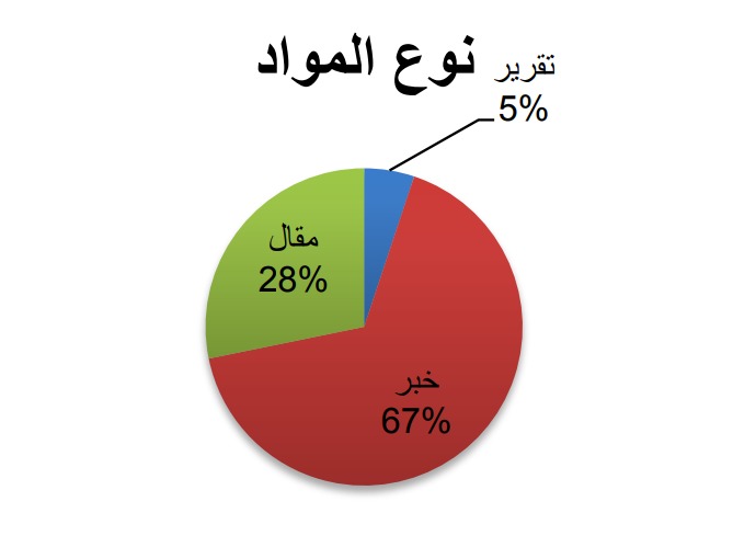 يظهر الرسم التوضيحي أن الخبر احتل المعدل الأكبر من نوعية المواد الصحفية بنسبة67% بينما احتلت المقالة 28%، وحصل التقرير على مساحة قليلة بنسبة 5%